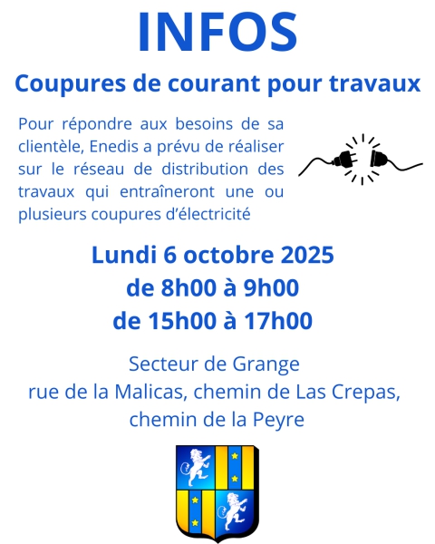 - Coupure d'électricité pour travaux : lundi 6 octobre 2025